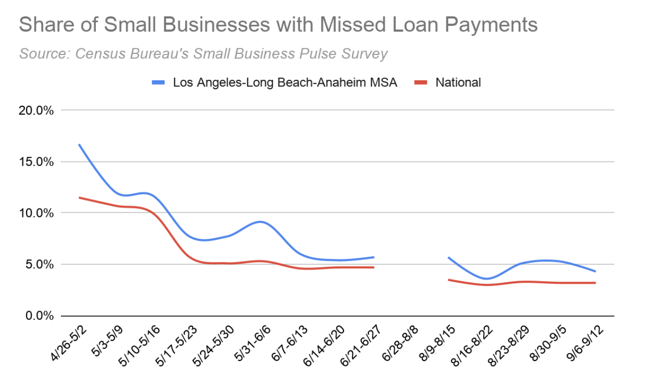 Access to credit is a challenge for small businesses everywhere, but will be exacerbated in the fallout of the COVID-19 crisis. Since mid-March, when the pandemic forced many businesses in Los Angeles to shut down, many have missed loan payments that were not forgiven or postponed. The Small Business Pulse Survey (see chart) found that the LA metro region has seen large spikes in missed loan payments through various waves of lockdowns. Though the rate has since declined, it remains above the national average. In the long-run, this will make it harder for small businesses in our city to stay afloat, especially as they seek additional bank loans to finance future investment.